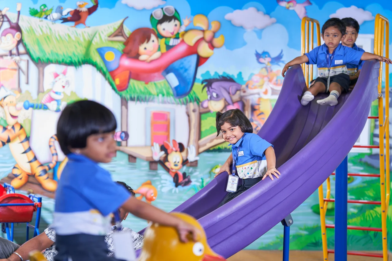 Irresistibly fascinating play area with slides and swings to enjoy and explore outdoors. Indoor Synthetic play area for the kindergarten to play safe.